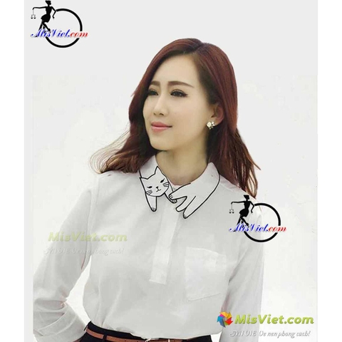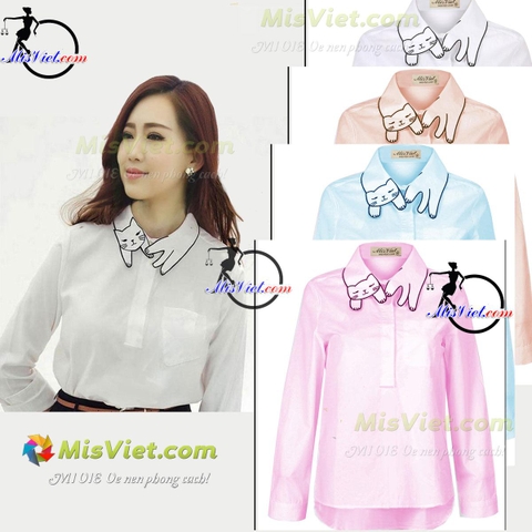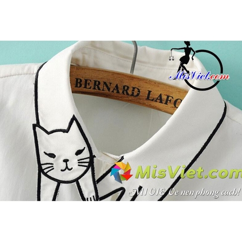 MV071 ÁO SƠ MI THÊU HIỆN ĐẠI M -Trắng (hình mèo) (Trắng, xanh nhạt, hồng nhạt, cam nhạt)
